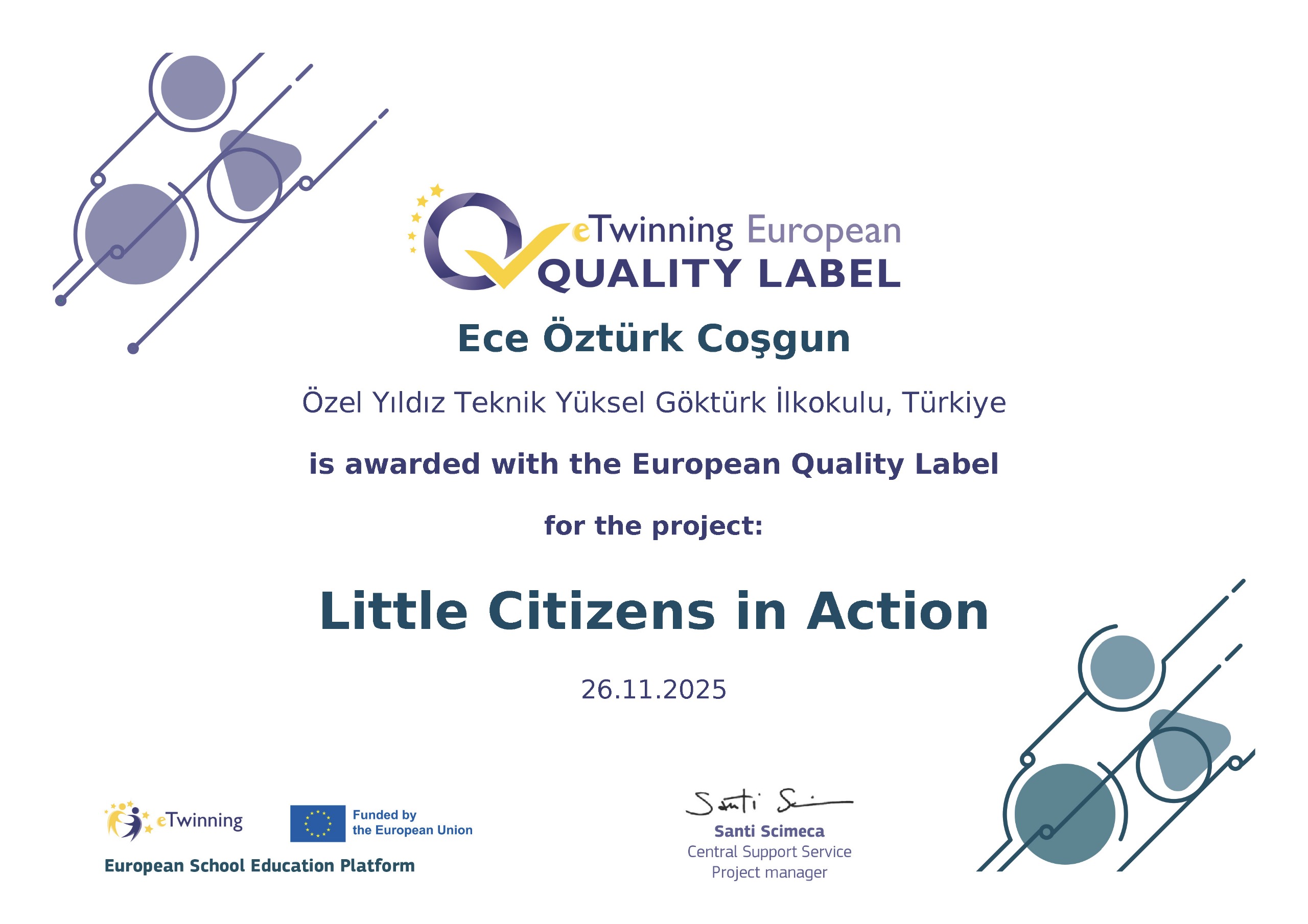 2024–2025 Eğitim Öğretim yılında Okul Öncesi Öğretmeni ve Okul Öncesi Alan Lideri Ece Öztürk Coşgun tarafından yürütülen "Little Citizens in Action" eTwinning projemiz, Ulusal ve Avrupa Kalite Etiketi almaya hak kazandı!